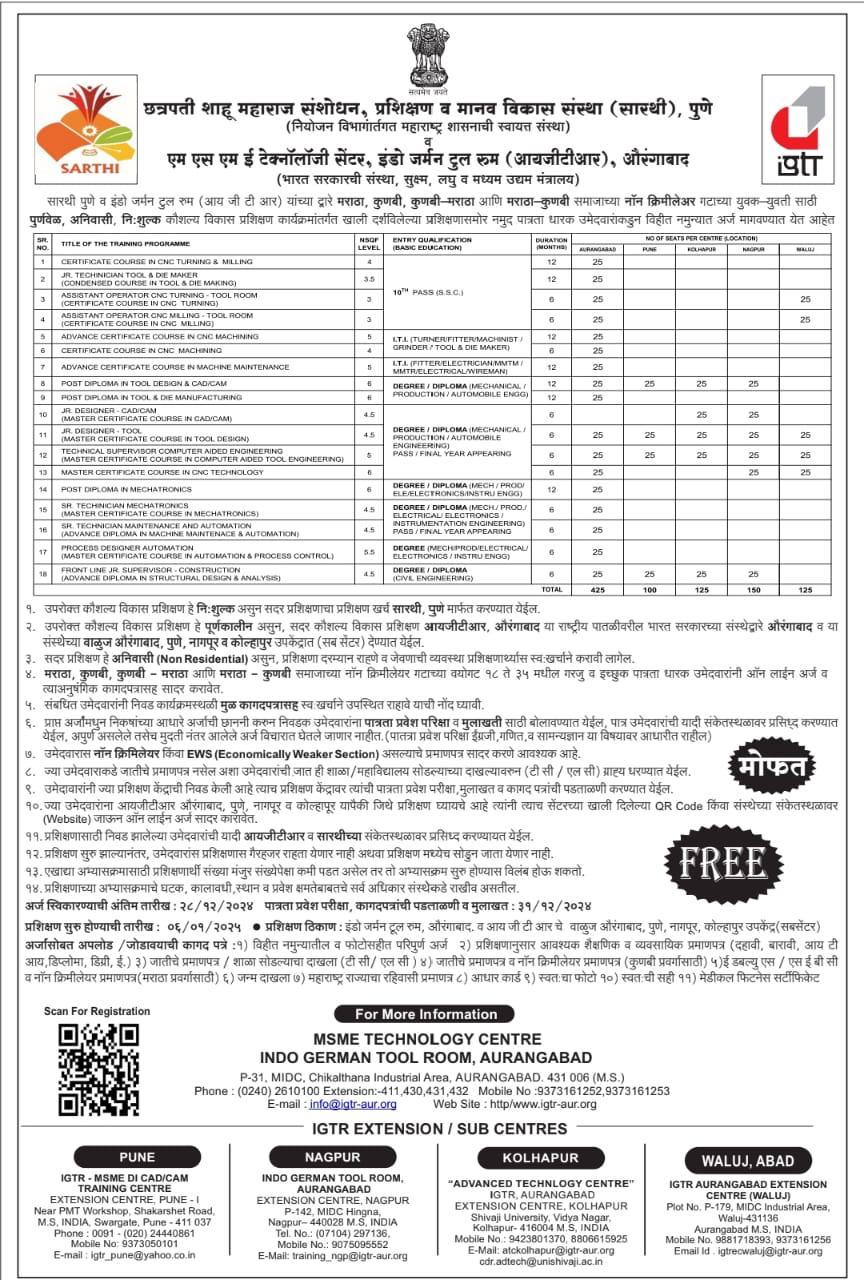 | 2 | Closed | श्रीमंत मालोजीराजे भोसले सारथी (सारथी) पुणे व इंडो जर्मन टुल (IGTR), औरंगाबाद कौशल्य विकास प्रशिक्षण कार्यक्रम - जाहिरात | 20-12-2024 | 31-12-2024 |